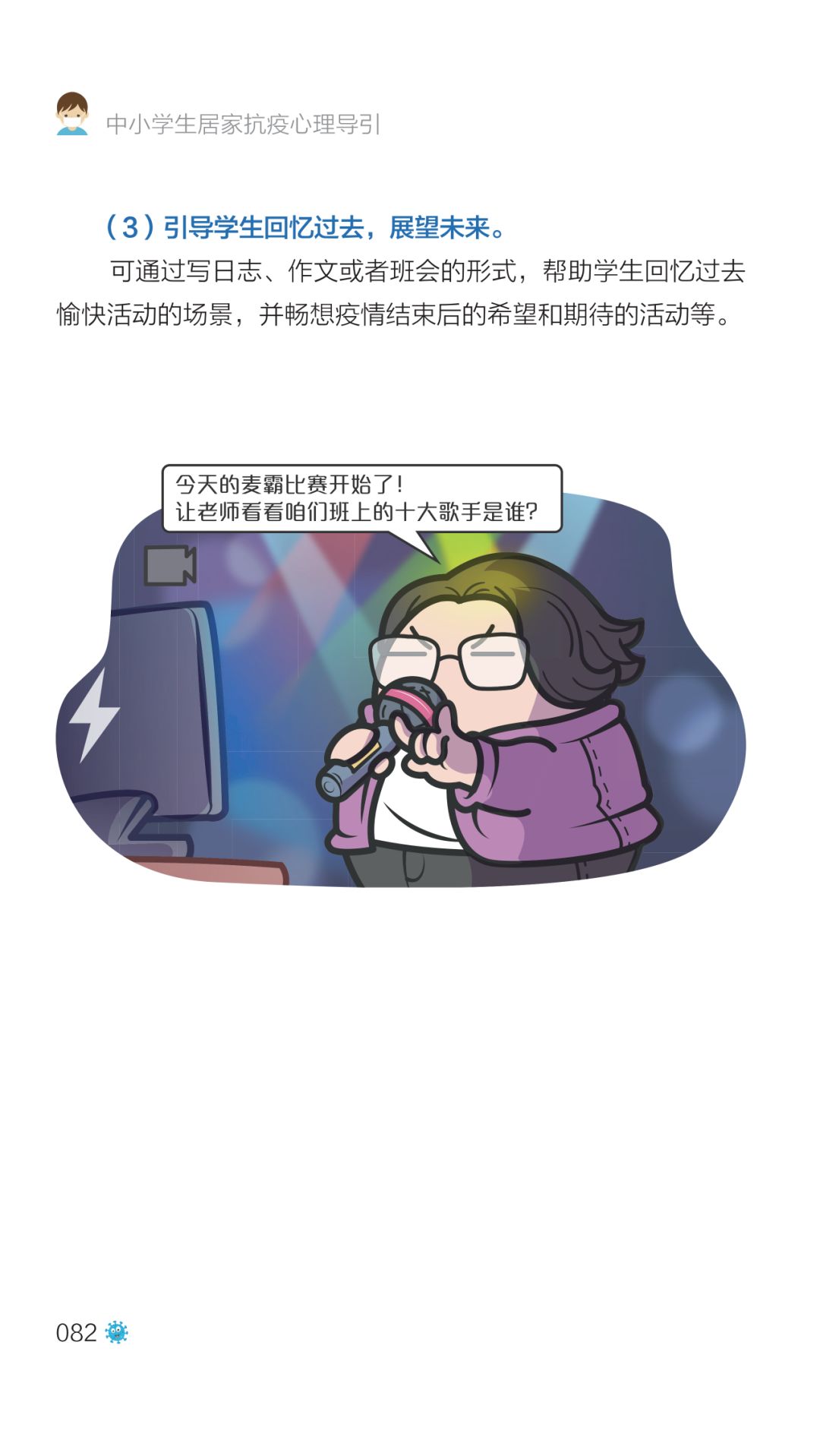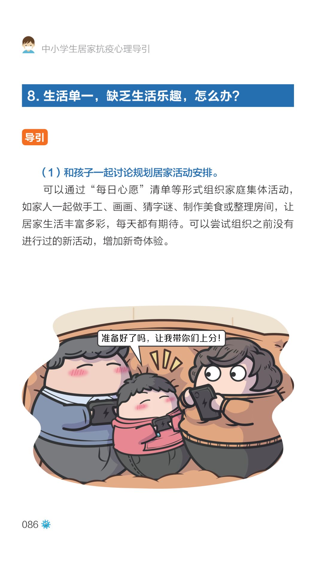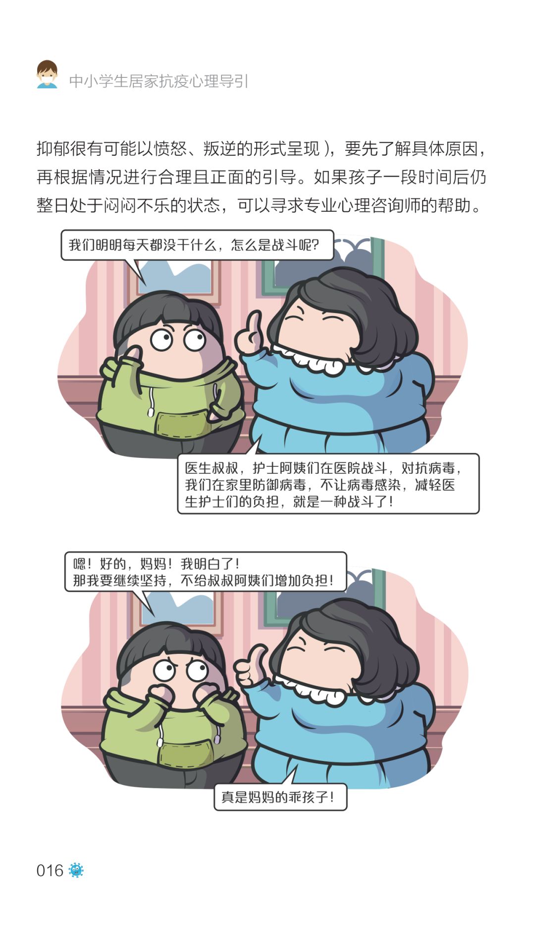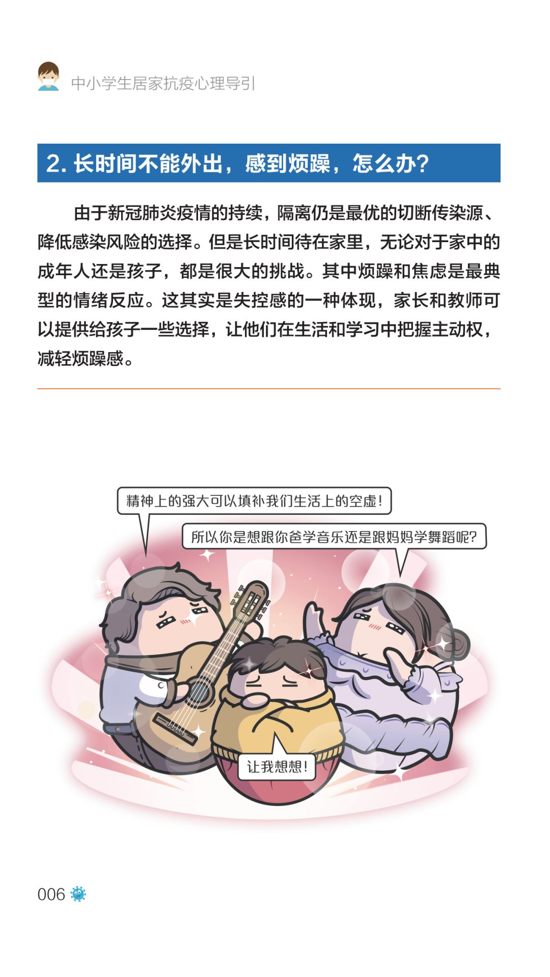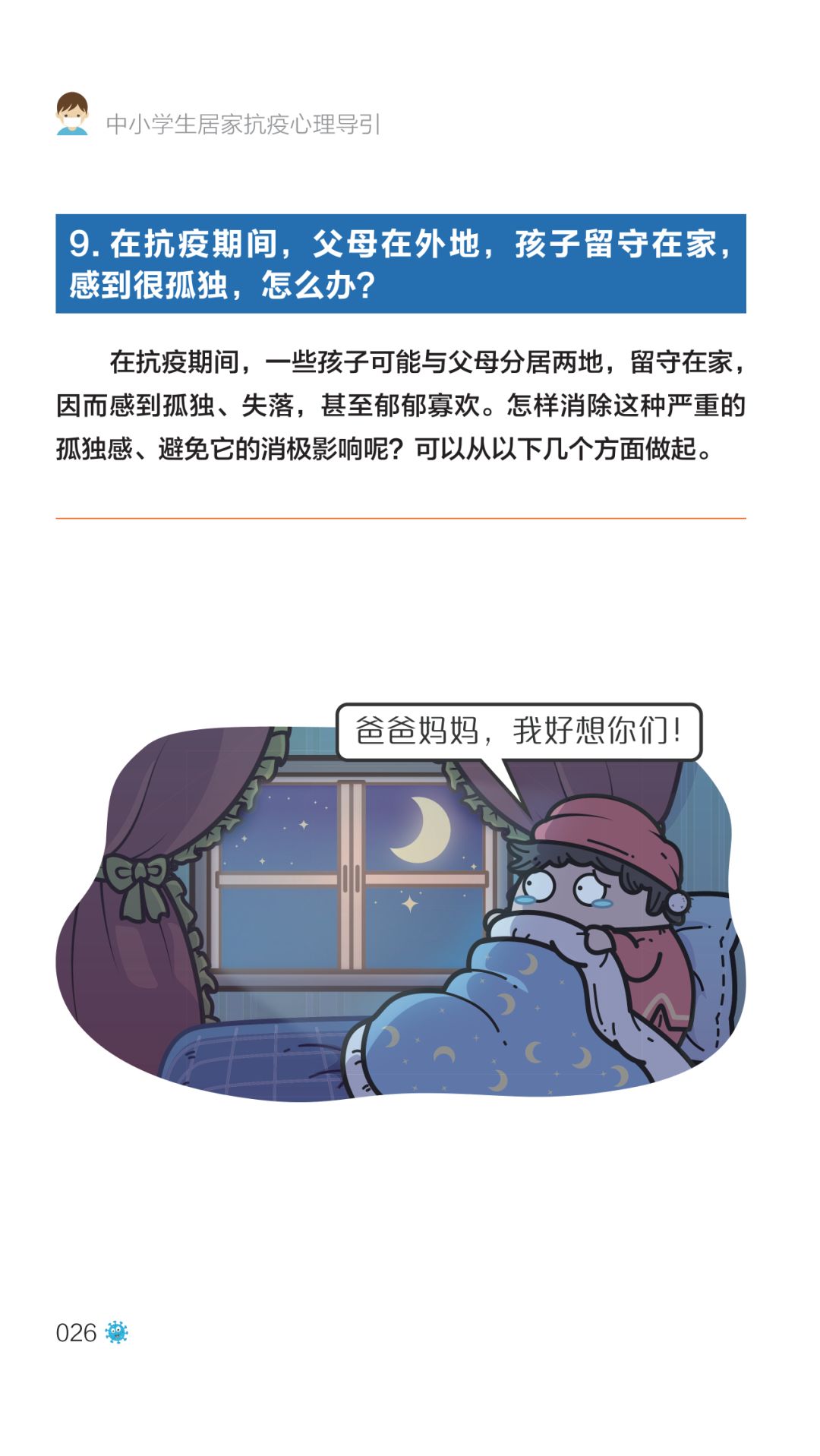 当他们面对大量有关疫情的信息无从分辨时,会感到恐惧和焦虑;当他们因疫情不得不长期居家难见朋友时,会感到拘束和烦闷;当他们因家人投入一线抗疫工作无法合家团圆时,会感到担忧和孤独;而在中小学全面开展在线教育时,他们更是面临着全新的挑战。