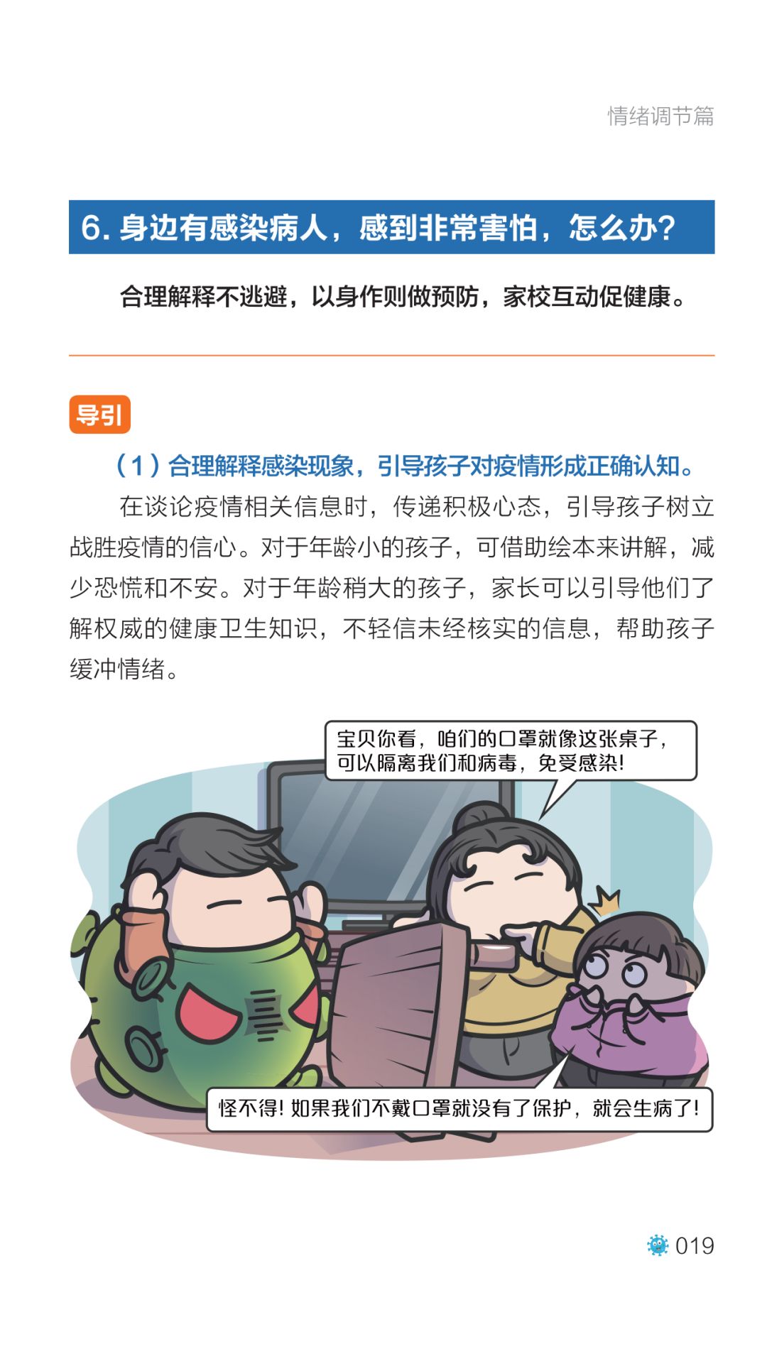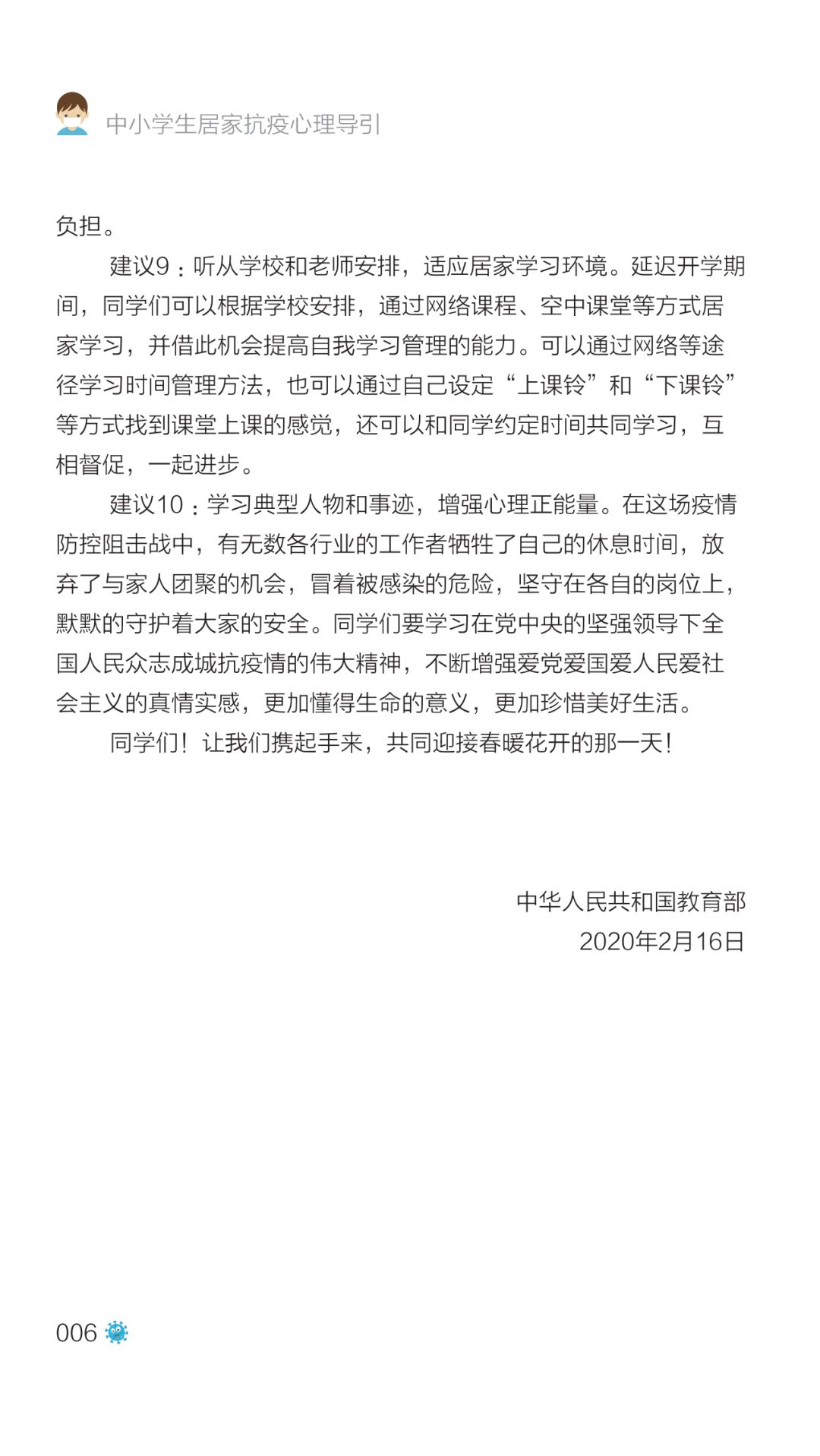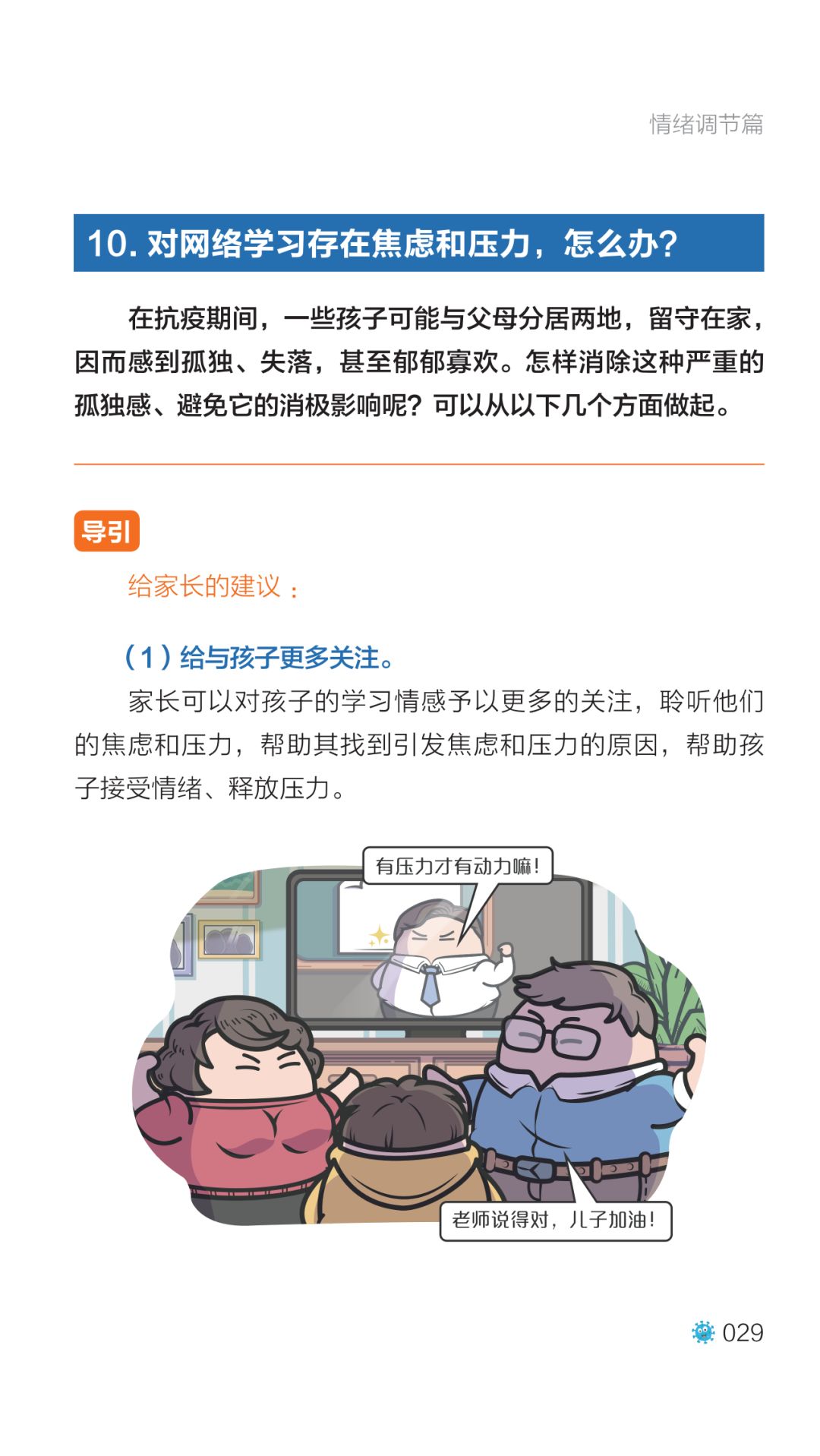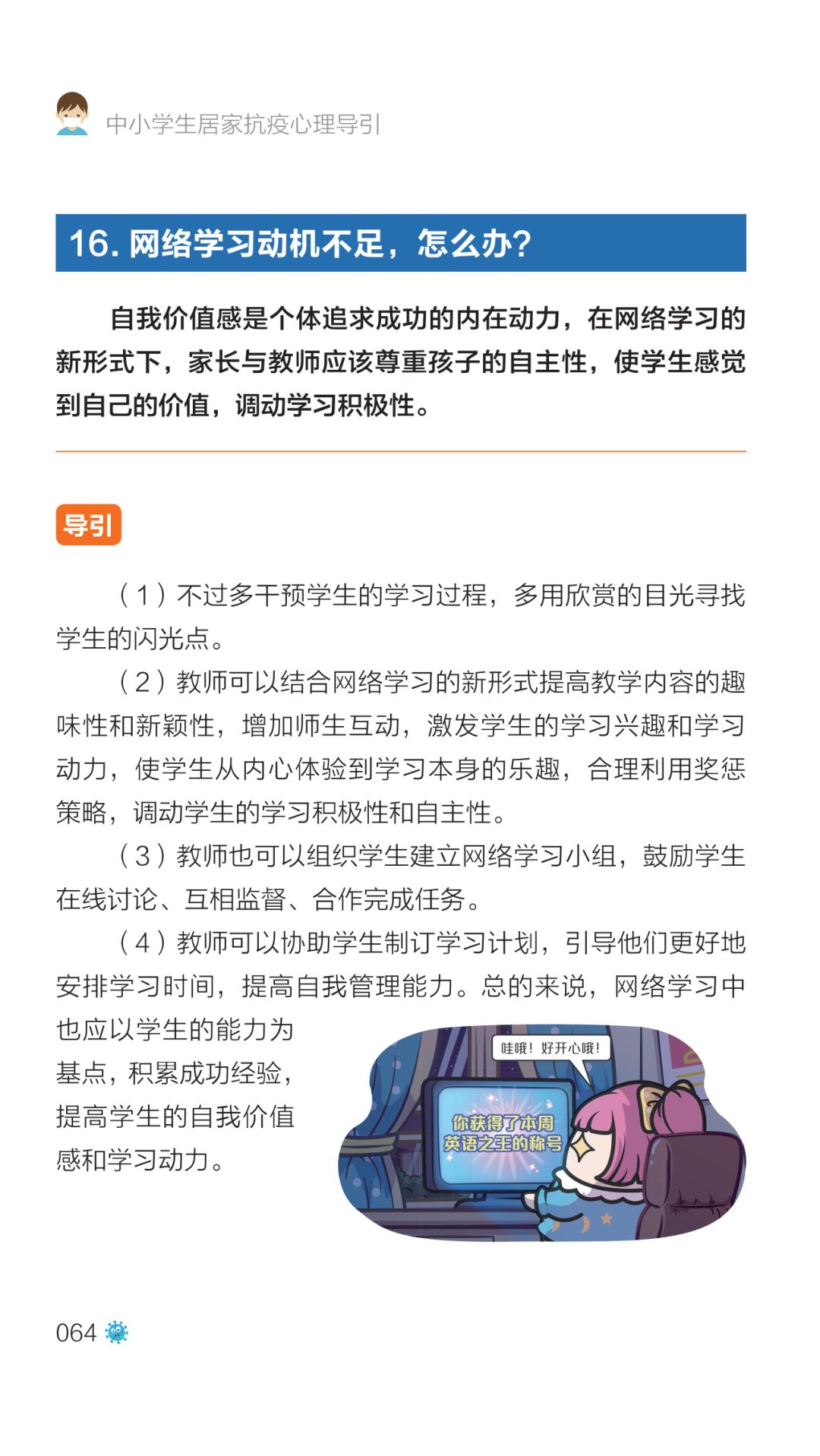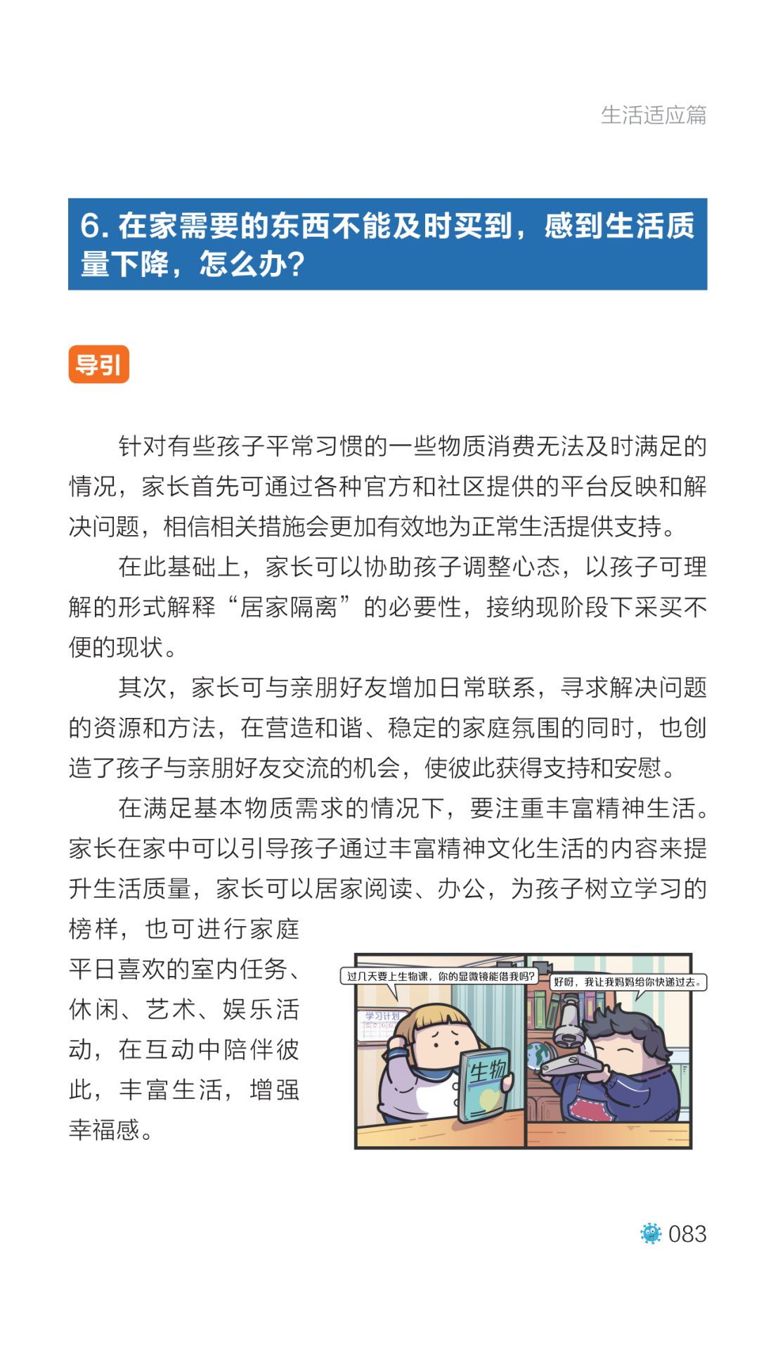 当他们面对大量有关疫情的信息无从分辨时,会感到恐惧和焦虑;当他们因疫情不得不长期居家难见朋友时,会感到拘束和烦闷;当他们因家人投入一线抗疫工作无法合家团圆时,会感到担忧和孤独;而在中小学全面开展在线教育时,他们更是面临着全新的挑战。