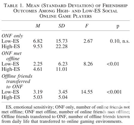 文献来源:Kowert, R., Domahidi, E., & Quandt, T. (2014). The relationship between online video game involvement and gaming-related friendships among emotionally sensitive individuals. Cyberpsychology, Behavior, and Social Networking.