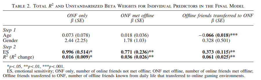 为了验证情绪敏感性和线上友谊之间的关系,研究者进行了三重回归分析,统计结果如下图所示: