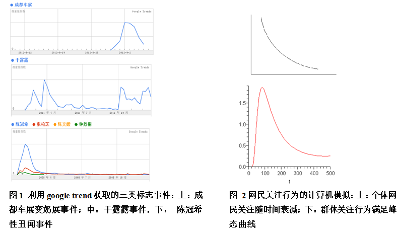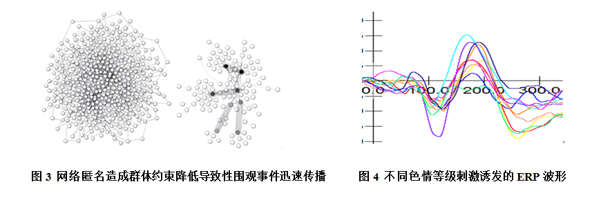 网络性围观分为三类:网民驱动事件,网络推手驱动事件,媒体驱动事件。其代表性事件分别为:陈冠希性丑闻事件,干露露浴室门事件,成都车展事件。利用google trend 和网络爬虫,获取网络“性”围观事件数据。形态学数据分析发现:网络推手驱动事件在潜伏期和波幅上与其它两类事件存在差异。网民驱动事件在发展动力中与其它两者存在差异。基于此,本文提出:单个网民对事件关注满足指数衰减假设,并提出心理计算模型。模拟结果表明:单个网民对事件关注满足指数衰减,网民群体参与行为急剧上升并达到饱和之后而衰减,和网络数据基本匹配,网民群体道德(公德)水平指数形式急剧下降。“复杂网络”模拟方式发现,群体匿名关系,导致网络连接性降低,是影响网络色情信息传播的关键因素之一。ERP(事件相关脑电位)的结果表明,网络“色情事件”的色情等级,名人效应是影响个体传播的关键心理因素。
