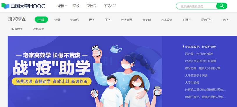 中国大学MOOC的课程资源:8000余门优质在线课程资源,涵盖本科12个学科门类所有专业类和高职18个专业大类。在疫情期间开设了战疫助学专项,其中猴博士课程2月免费学。
